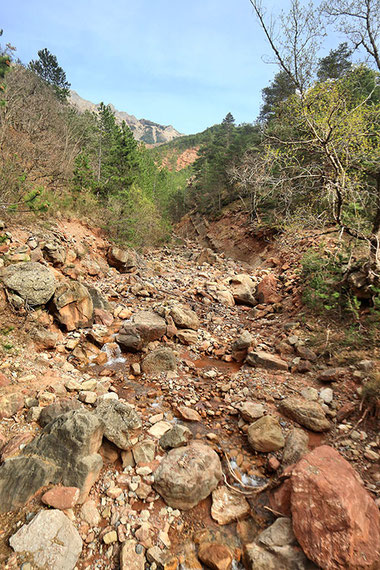 Die teilgerundeten großen Gesteinsblöcke im Wasser zeigen, welche Kraft der Wildbach nach Tagen mit viel Niederschlag entwickeln kann.