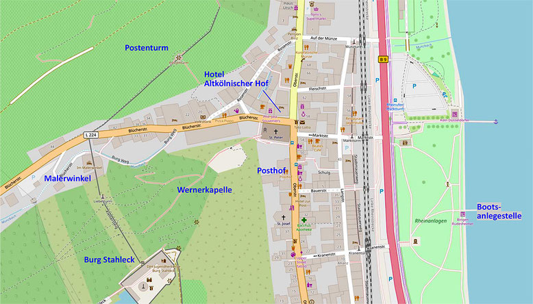 Übersichtskarte Bacharach (Quelle: OpenStreetMap, Lizenz CC-BY-SA 2.0).