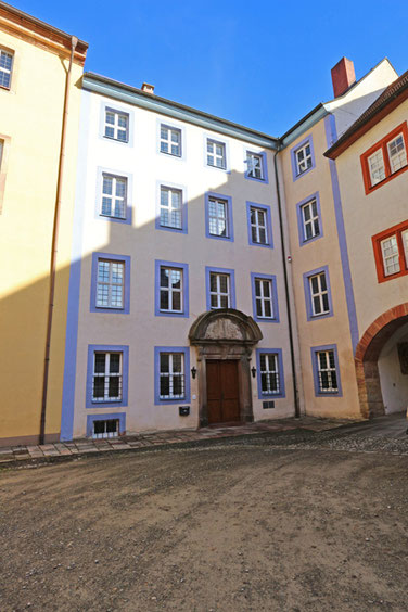 Links Gelbes, Blaues und Rotes Schloss innerhalb des Schlosshofs, rechts der polygonale Turm am Blauen Schloss vor der Durchfahrt zum Innenhof.