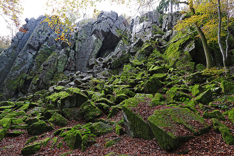 Anfahrt: Von Fulda kommend, folgt man der B458 und erreicht auf Höhe der Ortschaft Poppenhausen nach 15,5 km Fahrtstrecke die Landesstraße L3330, der man in nördliche Richtung folgt. Bereits nach 1,5 km Strecke erreicht man den Parkplatz, der sich etwas zurückgesetzt auf der linken, bzw. westlichen Seite der Straße befindet. Von hier aus sind es noch etwa 100 m bis zur Steinwand, die bei Kletterern sehr beliebt ist. Läuft man den Rundweg, der sich auf der Südseite überwiegend am Fuß der Wand und auf der Nordseite mal am Fuß, mal in Gipfelnähe bewegt, so führt dieser vom Parkplatz aus zunächst moderat bergab. Den Rückweg tritt man dann sinnvollerweise auf der jeweils gegenüberliegenden Seite an. Die Gesamtstrecke wird etwas mehr als 1 km betragen. Die aus grünlich-grauem Phonolith („Klingstein“) aufgebaute Steinwand ist eine der besonders beeindruckenden Sehenswürdigkeiten der Rhön. Die mittlere Höhe der mehrere hundert Meter langen und bis zu 20 m hohen Wand dürfte etwa 10 bis 15 m betragen. Charakteristisch für den Phonolith ist die Ausbildung großformatiger Gesteinssäulen, deren herausragendstes Beispiel vielleicht der Devil`s Tower in den USA darstellt. Doch so extrovertiert kommt kein Rhöner Geotop daher. Wie so viele Sehenswürdigkeiten der Rhön ist auch die Steinwand gut im Wald versteckt. Wer sie nicht gezielt sucht, hat gute Chancen an diesem Kleinod vorbeizufahren. Das an sonnigen Tagen durch den lichten Hochwald auf die Felswand, auf umgefallene Bäume und heruntergebrochene, wahllos übereinander getürmte, bemooste Gesteinssäulen fallende Licht erzeugt eine märchenhafte Szenerie.