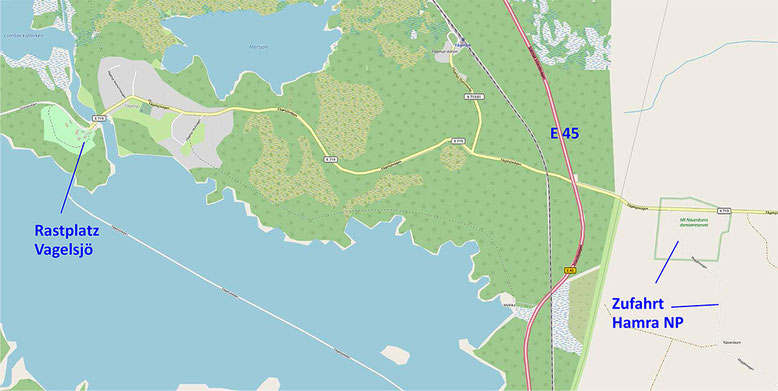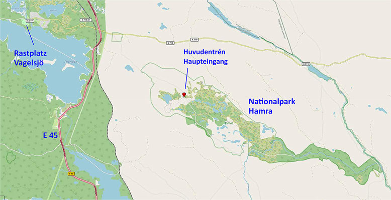 Stellplatz Vagelsjö, Zuwegung und Lage des Haupteingangs im Nordwesten des Hamra Nationalparks (Quelle: openstreetmap, Lizenz CC-BY-SA 2.0).
