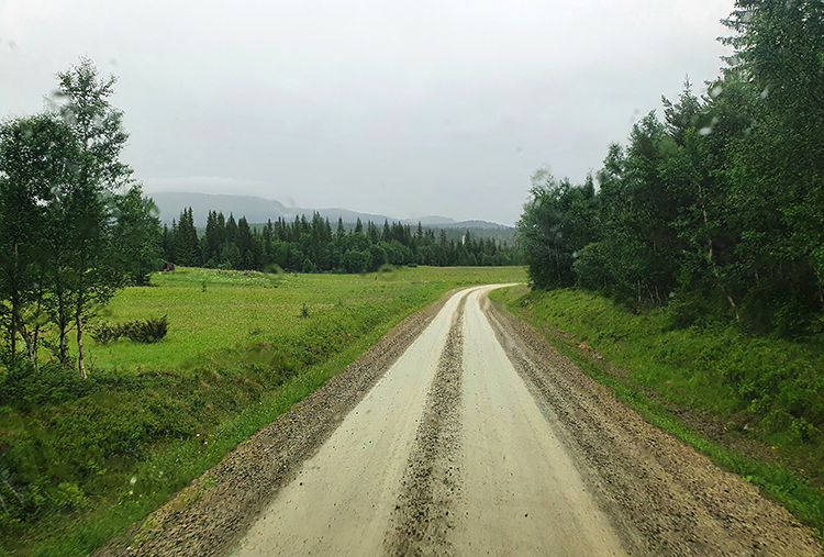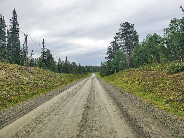 Irgendwo zwischen Flatruet und Hede knurrt uns dann doch der Magen und wir halten am Rande der Schotterpiste an, um Frühstück zu machen. Schön stehen wir nicht, aber der Regen hat längst eingesetzt und dichte Regenwolken und über Wäldern und Wiesen aufsteigender Wasserdampf packen die Landschaft in graue Schleier. Da möchte man gar nicht mehr aus dem Fenster schauen. Das Auto ist inzwischen schon wieder komplett versaut durch den grauen Schlamm, den die Reifen von der Schotterpiste aufnehmen. Wenn wir ehrlich sind, müssen wir zugeben, dass wir solche Wetterbedingungen eigentlich viel öfter erwartet hätten und bisher doch ziemlich glimpflich davon gekommen sind. So gesehen fällt uns die Entscheidung von einem Besuch im Fulufjället und Sonfjället-Nationalpark abzusehen, dann ein wenig leichter. Trotzdem ist es ärgerlich so weit gefahren zu sein und dann die Segel streichen zu müssen.