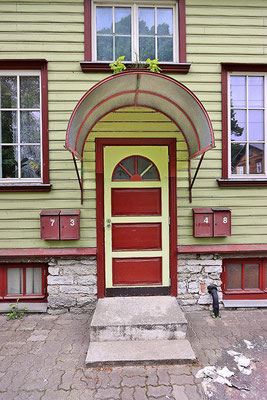 Jenseits des gelben Holzhauses folgen nun eine ganze Reihe älterer Holzhäuser, die wir gerne fotografiert hätten. Die Sache hat allerdings einen Haken. Vor den Gebäuden stehen dicht an dicht Bäume, die die Sicht auf die Häuser versperren. Hier noch eines der wenigen Häuser mit freier Sicht.