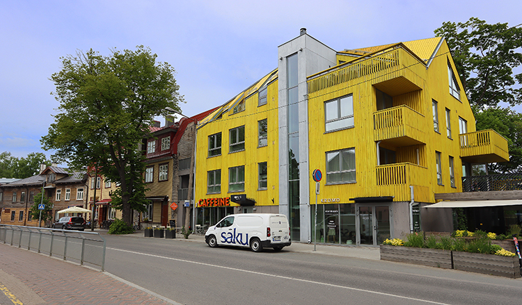 Von hier aus folgen wir der Kopli Straße (Kopli Tänav) in westliche Richtung und treffen unmittelbar nordwestlich des Balti Jaama Turg (Turg = Markt) auf ein hübsches, neu errichtetes Holzhaus mit knallgelbem Anstrich.