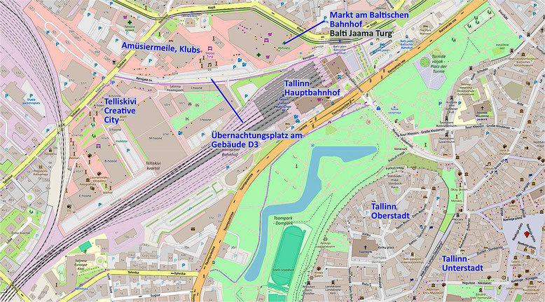 Karte bitte anklicken, um eine vergrößerte Darstellung zu erhalten! Das Kärtchen zeigt unseren ersten Übernachtungsplatz am Markt am Baltischen Bahnhof (Balti Jaama Turg) und das Umfeld des Marktes (Quelle: OpenStreetMap, Lizenz CC-BY-SA 2.0).