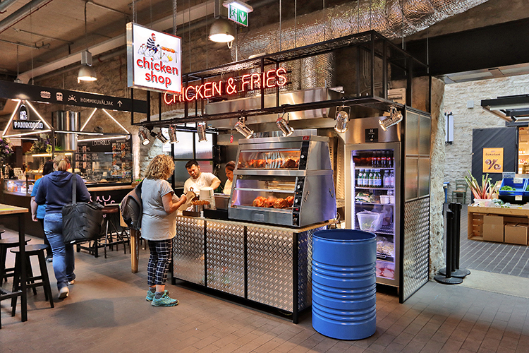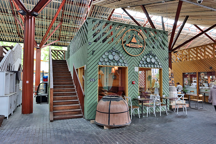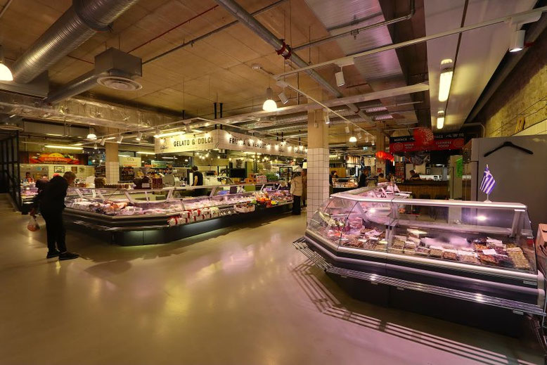 Kleine Cafés und Streetfoodstände aller Art bieten, wie hier unter dem Vordach der Halle, aber auch im Erdgeschoss der Markthalle, unterschiedlichste Speisen an.
