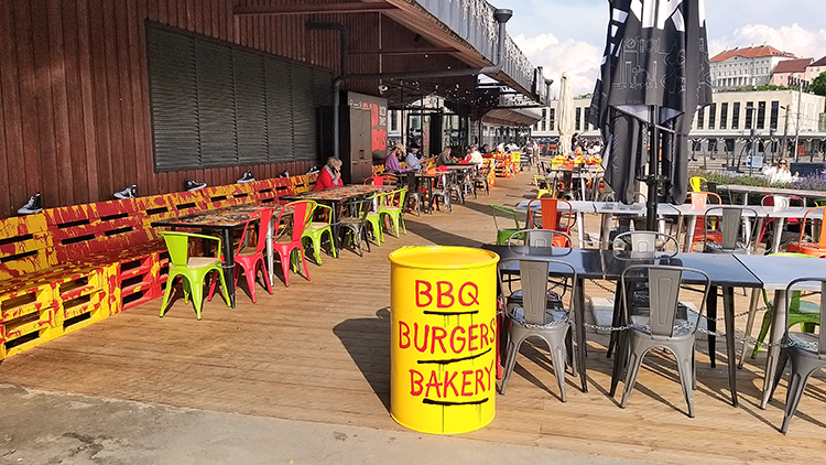 Auf der Südseite der Markthalle gibt es eine große Außenterrasse, auf der man einen Drink oder auch Streetfood genießen kann.