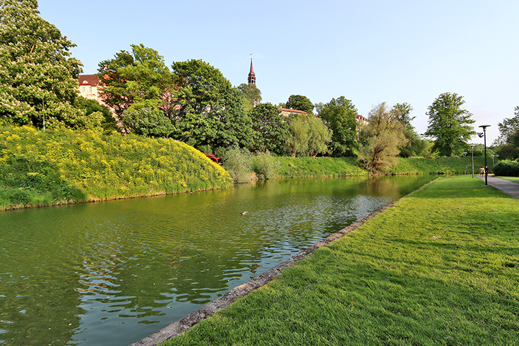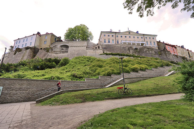 Vom Bahnhof laufen wir nach Osten in die Grünanlage Dompark. Hier folgen wir dem Snells Teich (Snelli tiik) am westlichen Fuß der Oberstadt, bis wir den Aufgang in die Oberstadt erreichen (Treppenaufgang am Stenbockhaus).