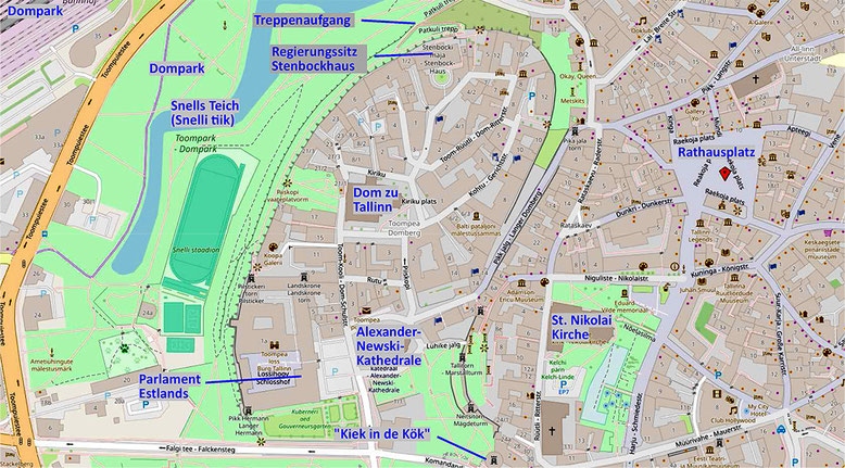 Übersichtskarte Tallinn Oberstadt bzw. Domberg mit den wichtigsten repräsentativen Gebäuden des Landes (Quelle: OpenStreetMap, Lizenz CC-BY-SA 2.0).