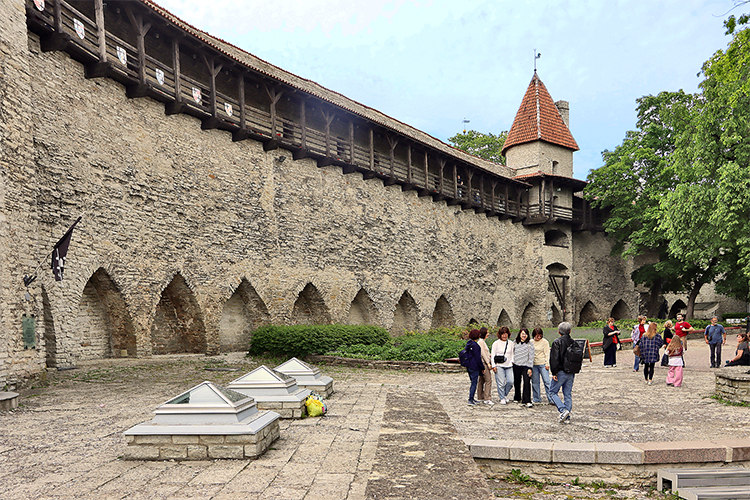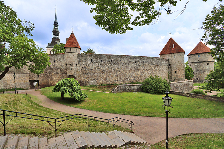 Der Marstallturm (estnisch Tallitorn), hier zu sehen direkt neben der St. Nikolai Kirche, ist ein Wehrturm der Revaler Stadtbefestigung. Er befindet sich an der südwestlichen Seite der Revaler Altstadt am Kurzen Domberg (estnisch Lühike jalg). Etwas weiter südlich liegt der Wehrturm Mägdeturm, nördlich das Tor am Kleinen Domberg. Direkt an den Turm grenzt die Mauer der historischen Stadtbefestigung an. Ganz rechts im Bild der restaurierter Kanonenturm "Kiek in de Kök" (Schau in die Küche). Der Turm wurde 1475 gebaut, er ist 38 m hoch, hat einen Durchmesser von 17 m, die Mauern sind 3–4 m dick. Er war seinerzeit der größte seiner Art in Nordeuropa. Seinen niederdeutschen Namen verdankt er der deutschsprachigen Geschichte im Baltikum. „Kiek in de Kök“ wurde im Mittelalter für Türme geprägt, von denen aus sprichwörtlich in die Küchen der Bürger der Stadt geschaut werden konnte.