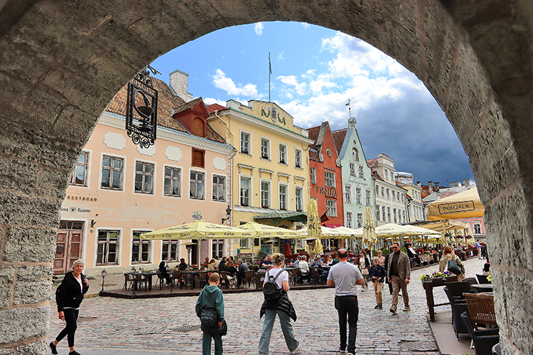 Gebäude und Restaurants am Raekoja Plats (Rathausplatz) in Tallinn.